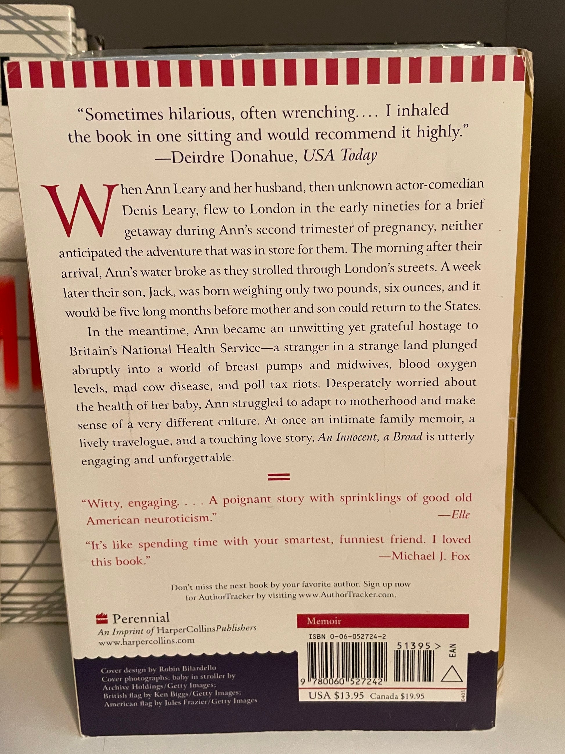 In the meantime, Ann became an unwitting yet grateful hostage to Britain's National Health Service -- a stranger in a strange land plunged abruptly into a world of breast pumps and midwives, blood oxygen levels, mad cow disease, and poll tax riots. Desperately worried about the health of her baby, Ann struggled to adapt to motherhood and make sense of a very different culture. At once an intimate family memoir, a lively travelogue, and a touching love story, An Innocent, a Broad is utterly engaging and unforgettable.