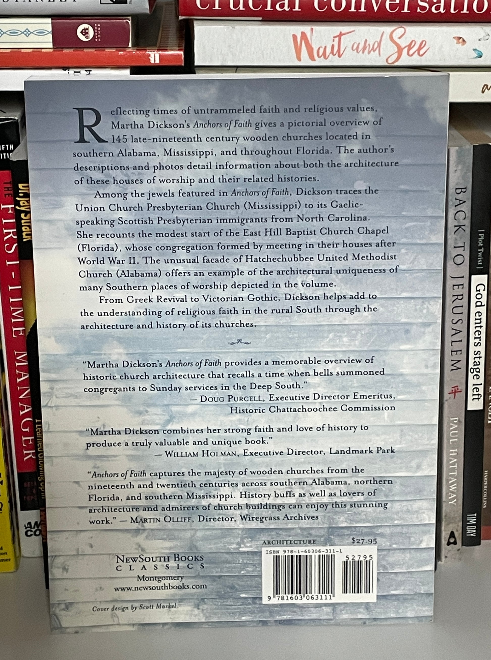 Among the jewels featured in Anchors of Faith, Dickson traces the Presbyterian Church of Union Church, Mississippi all the way back to its Gaelic-speaking Scottish Presbyterian immigrants from North Carolina. The author tells the story of the modest start of the East Hill Baptist Church Chapel in Tallahassee, whose congregation formed itself by meeting in one another's houses due to World War II. The distinctive details of the unusual "house of cards"-like facade of Hatchechubbee United Methodist Church in Hatchechubbee, Alabama, and the Carpenter Gothic style of St. Luke's Episcopal Church in Merritt Island, Florida reveal the architectural uniqueness of some Southern places of worship.