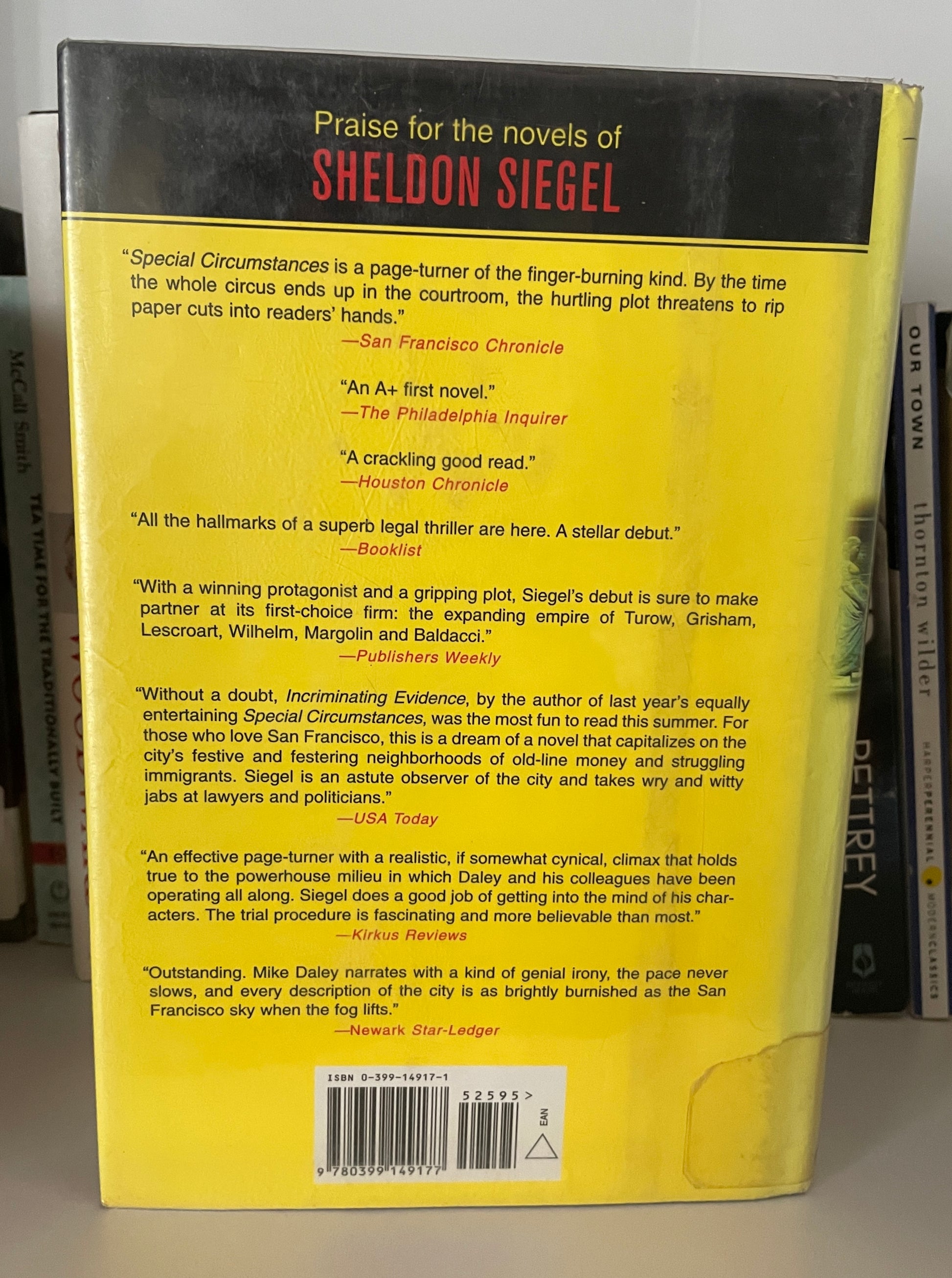 A new thriller by the author of Special Circumstances and Incriminating Evidence follows the adventures of an ex-priest, and ex-corporate lawyer, and an ex-wife who open their own criminal defense firm. 50,000 first printing.