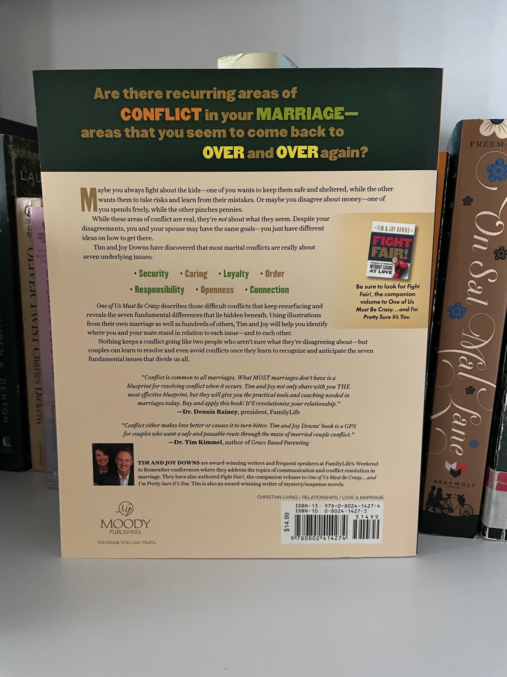 In this companion to Fight Fair! (a treatise on "winning at conflict without losing at love"), Tim and Joy Downs capture the heart of marital differences. This time they concentrate less on how to fight fair, and more on making sense of the differences that divide us. With marriages coming under attack from seemingly every angle these days, conflict is seen as grounds to end a marriage, rather than an opportunity to grow closer to each other and to God. One of Us Must Be Crazy... and I'm Pretty Sure It's You is a unique and manageable resource for equipping couples to learn the true nature of their conflicts and deal with them in a way that will actually help their marital fulfillment. By interacting candidly and honestly with such issues as security, loyalty, responsibility, caring, order, openness, and connection, Tim and Joy Downs have created a resource that might simply make all the difference in your world.