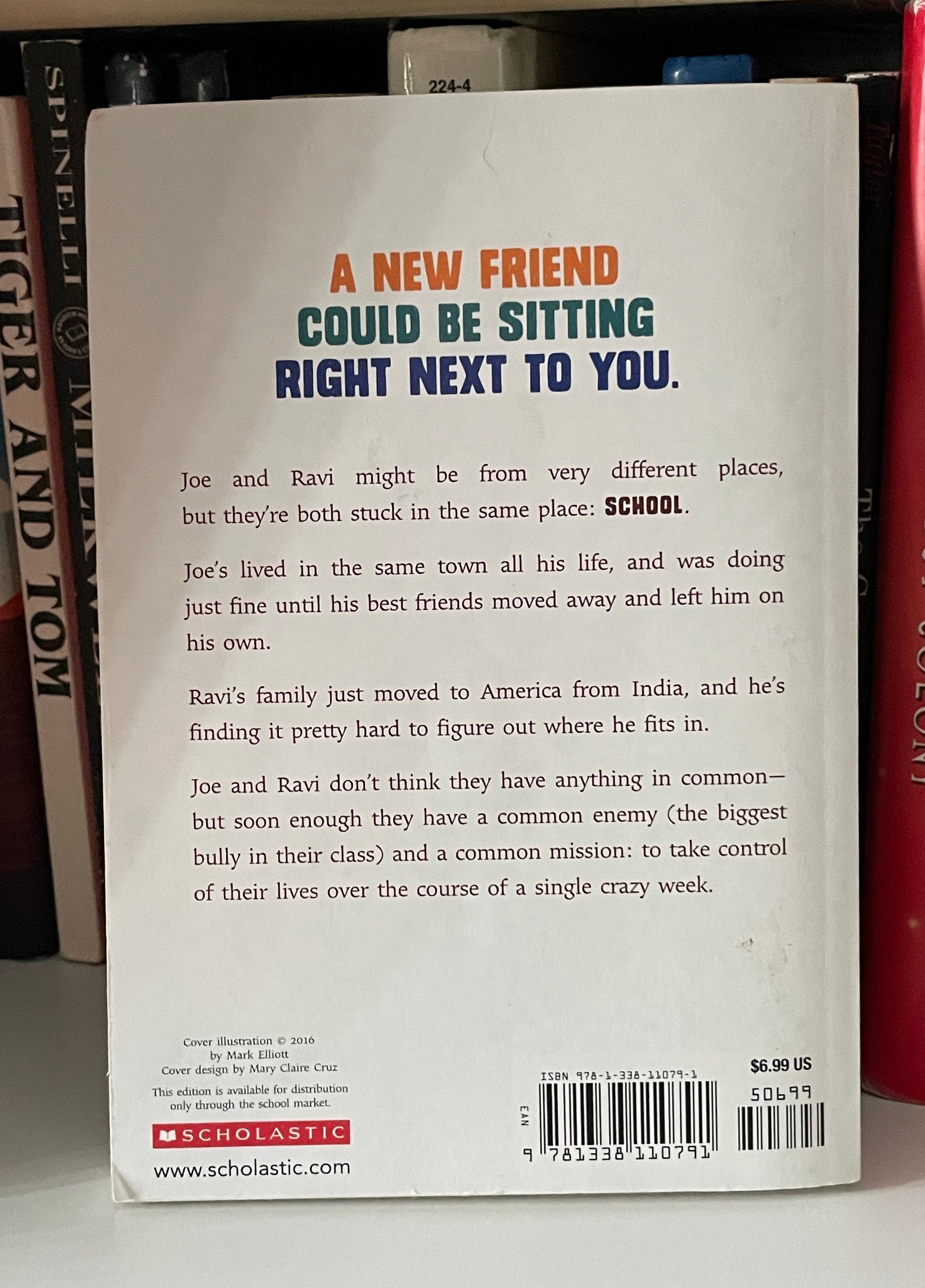 Joe and Ravi might be from very different places, but they're both stuck in the same place: school. Joe's lived in the same town all his life, and was doing just fine until his best friends moved away and left him on his own. Ravi's family just moved to America from India, and he's finding it pretty hard to figure out where he fits in. Joe and Ravi don't think they have anything in common, but soon enough they have a common enemy (the biggest bully in their class) and a common mission: to take control of their lives over the course of a single crazy week. Joe and Ravi might be from very different places, but they're both stuck in the same place: school. Joe's lived in the same town all his life, and was doing just fine until his best friends moved away and left him on his own. Ravi's family just moved to America from India, and he's finding it pretty hard to figure out where he fits in. Joe and Ravi don't think they have anything in common, but soon enough they have a common enemy (the biggest bully in their class) and a common mission: to take control of their lives over the course of a single crazy week. Product Details Item #: NTS811079 ISBN13: 9781338110791 Format: Paperback Book Pages: 240 Genre: Realistic Fiction Grades: 3 - 5 Lexile® Measure: 780L Guided Reading Level: GR Level S DRA Level: 40 - 50 ACR Level: 4.8