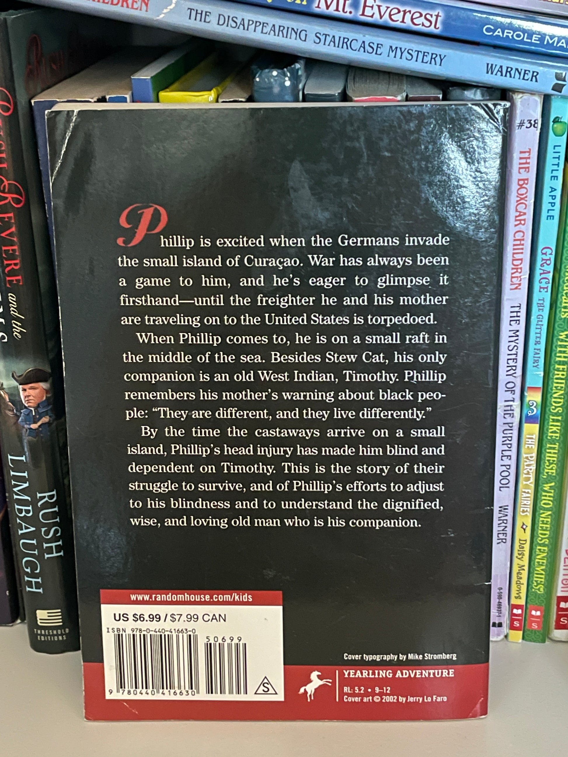 When Phillip comes to, he is on a small raft in the middle of the sea. Besides Stew Cat, his only companion is an old West Indian, Timothy. Phillip remembers his mother’s warning about black people: “They are different, and they live differently.”