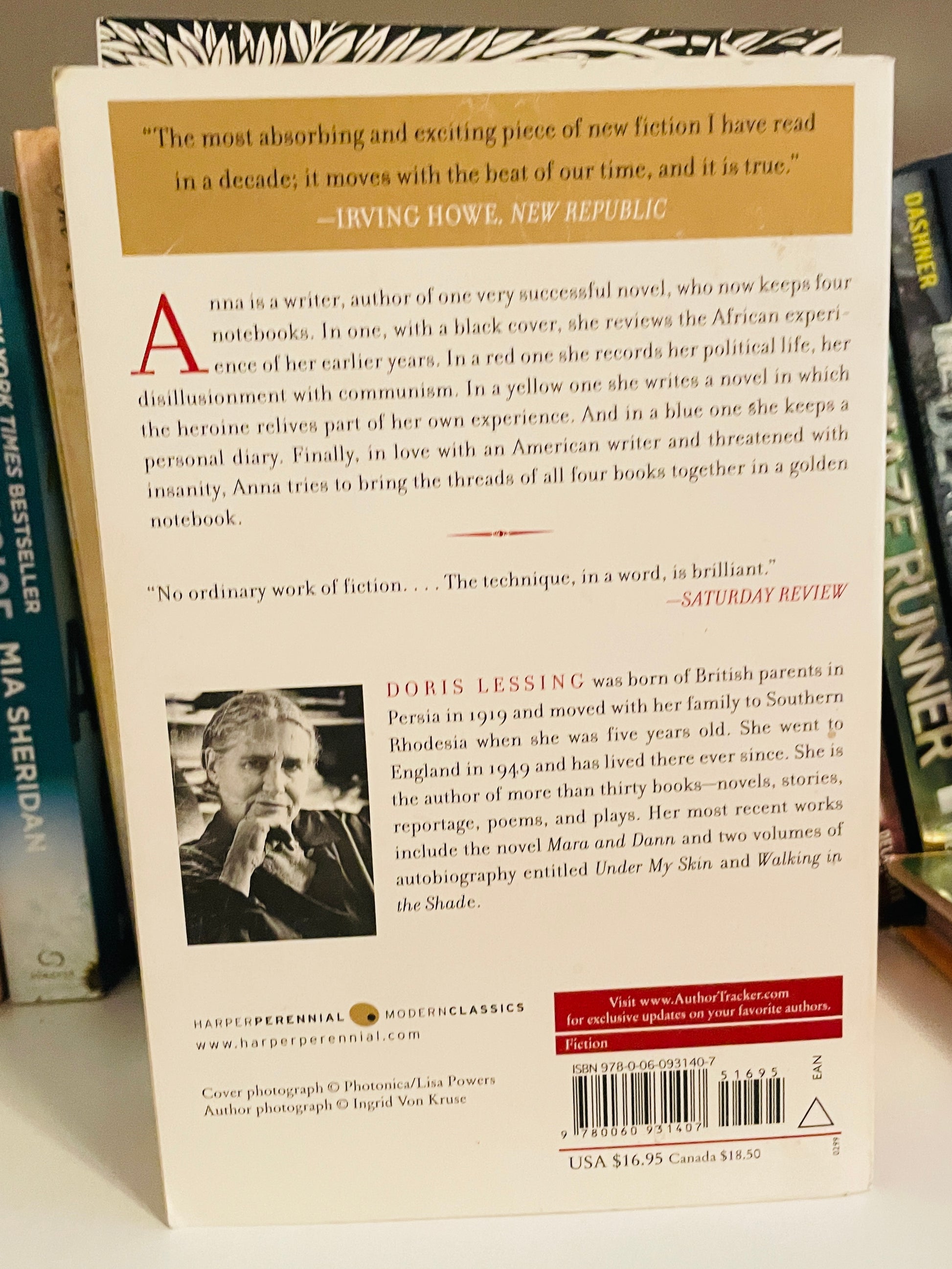 Anna is a writer, author of one very successful novel, who now keeps four notebooks. In one, with a black cover, she reviews the African experience of her earlier years. In a red one she records her political life, her disillusionment with communism. In a yellow one she writes a novel in which the heroine relives part of her own experience. And in a blue one she keeps a personal diary. Finally, in love with an American writer and threatened with insanity, Anna resolves to bring the threads of all four books together in a golden notebook.