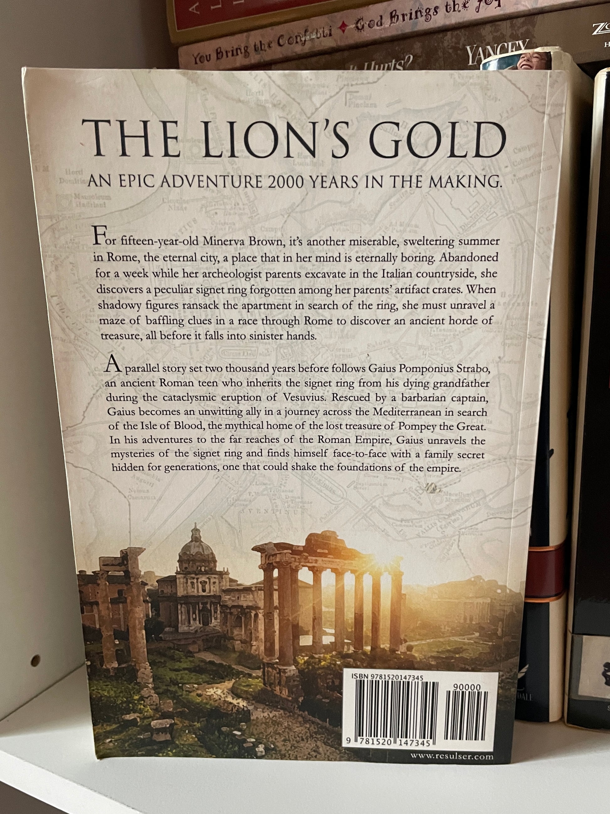 A mysterious ring holds the key to the greatest treasure of antiquity. For fifteen-year-old Minerva Brown, it's another miserable, sweltering summer in Rome, the eternal city, a place that in her mind is only eternally boring. Abandoned for a week while her archeologist parents excavate in the Italian countryside, she discovers a peculiar signet ring forgotten among her parents’ artifact crates. When shadowy figures ransack the apartment in search of the ring, she must unravel a maze of baffling clues in a race through Rome to discover an ancient horde of treasure, all before it falls into sinister hands. A parallel story set two thousand years before follows Gaius Pomponius Strabo, a Roman teen who inherits the signet ring from his dying grandfather during the cataclysmic eruption of Vesuvius. Rescued by a barbarian captain, Gaius becomes an unwitting ally in a journey across the Mediterranean in search of the Isle of Blood, the mythical home of the lost treasure of Pompey the Great. In his adventures to the far reaches of the Roman Empire, Gaius unravels the mysteries of the signet ring and finds himself face-to-face with a family secret hidden for generations, one that could shake the foundations of the empire.