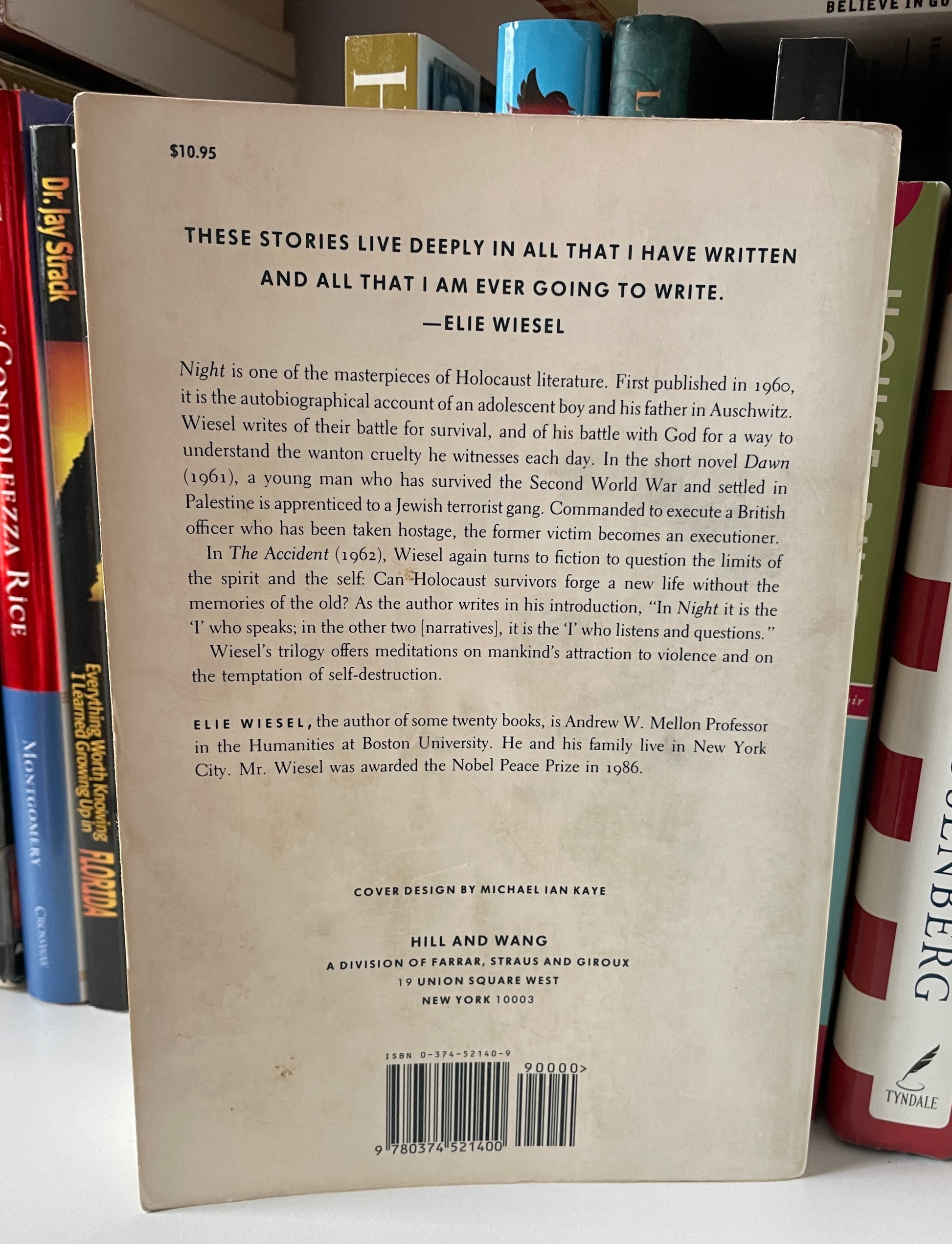 Night is one of the masterpieces of Holocaust literature. First published in 1960, it is the autobiographical account of an adolescent boy and his father in Auschwitz. Wiesel writes of their battle for survival, and of his battle with God for a way to understand the wanton cruelty he witnesses each day.