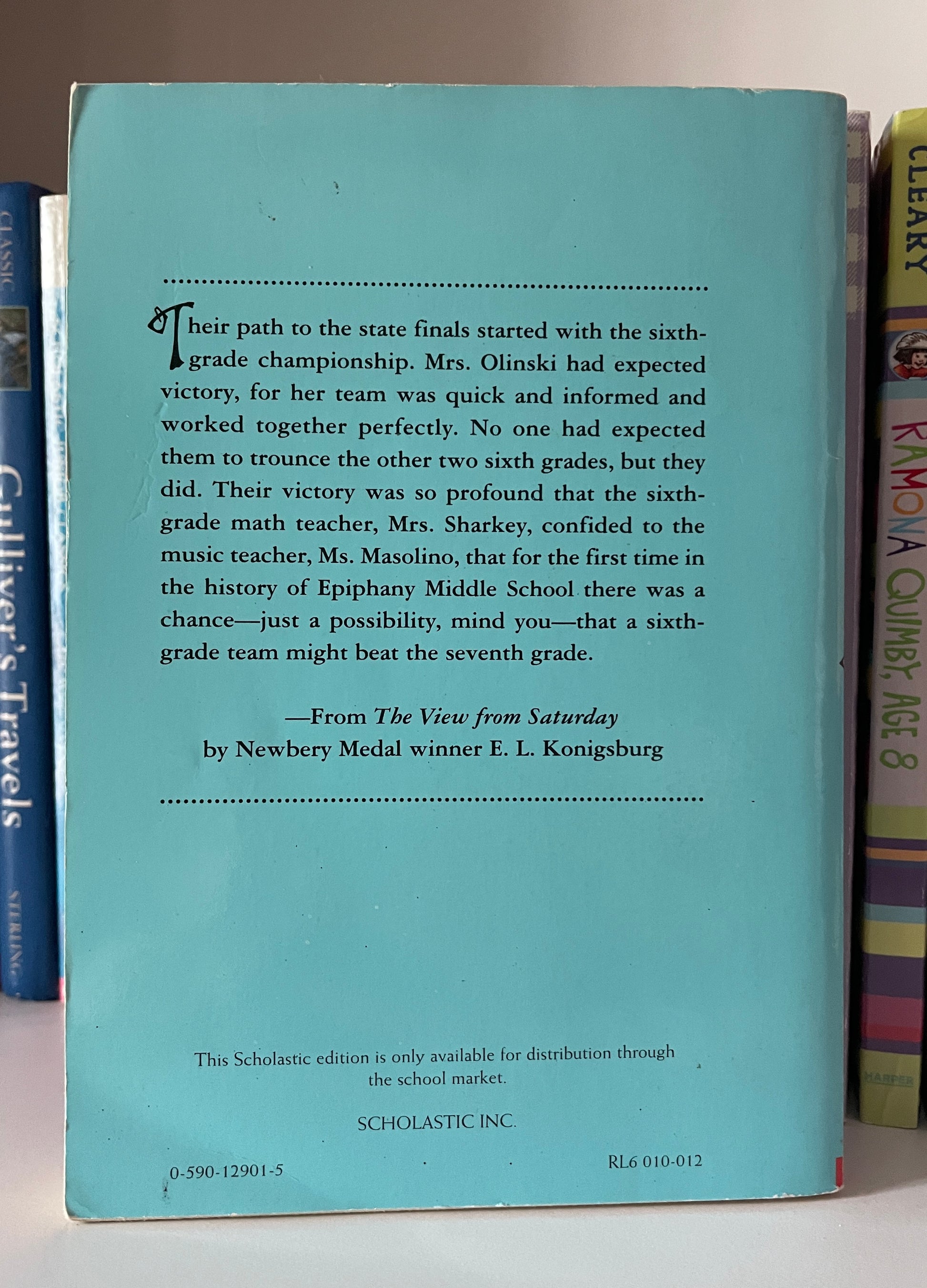 he had a number of answers. But were any of them true? How had she really chosen Noah and Nadia and Ethan and Julian? And why did they make such a good team? It was a surprise to a lot of people when Mrs. Olinski's team won the sixth-grade Academic Bowl contest at Epiphany Middle School. It was an even bigger surprise when they beat the seventh grade and the eighth grade, too. And when they went on to even greater victories, everyone began to ask: How did it happen? It happened at least partly because Noah had been the best man (quite by accident) at the wedding of Ethan's grandmother and Nadia's grandfather. It happened because Nadia discovered that she could not let a lot of baby turtles die. It happened when Ethan could not let Julian face disaster alone. And it happened because Julian valued something important in himself and saw in the other three something he also valued. Mrs. Olinski, returning to teaching after having been injured in an automobile accident, found that her Academic Bowl team became her answer to finding confidence and success. What she did not know, at least at first, was that her team knew more than she did the answer to why they had been chosen. This is a tale about a team, a class, a school, a series of contests and, set in the midst of this, four jewel-like short stories -- one for each of the team members -- that ask questions and demonstrate surprising answers.